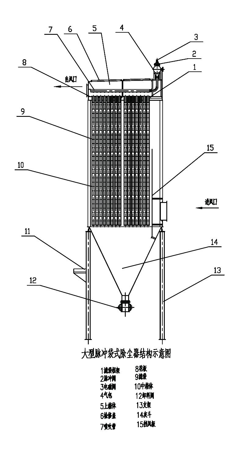 CD長袋脈沖袋式除塵器的主體結(jié)構(gòu)由上箱體、中箱體、袋室、灰斗、卸灰裝置、噴吹裝置、和控制儀幾大部分組成。并配有基礎(chǔ)支柱、爬梯、欄桿、檢修門等等,并可根據(jù)用戶要求選配先進(jìn)的設(shè)備運行監(jiān)測系統(tǒng)。